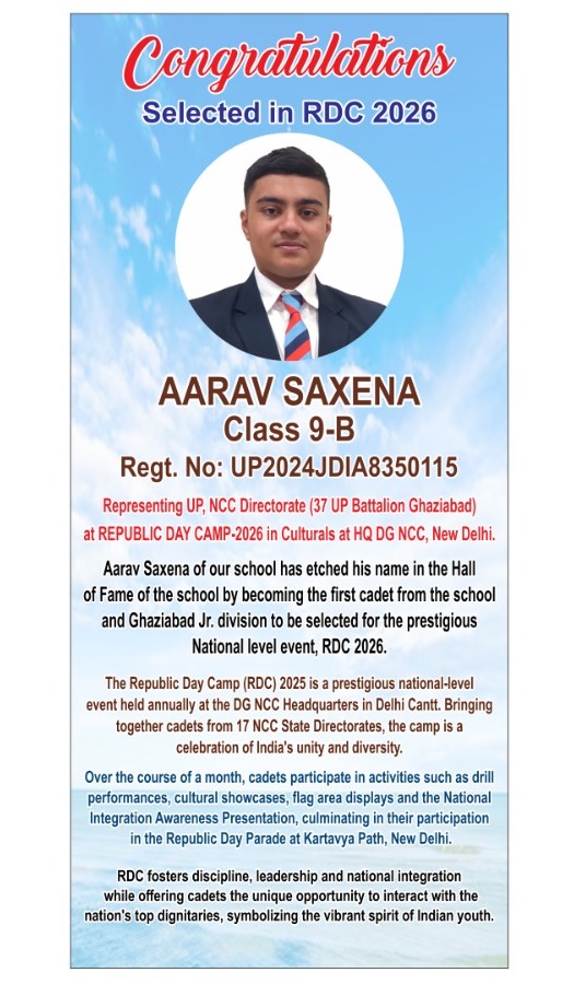 Aarav Saxena of our school has etched his name in the Hall of Fame of the school by becoming the first cadet from the school and Ghaziabad Jr. division to be selected for the prestigious National level event, RDC 2026 in the entire state of Uttar Pradesh.